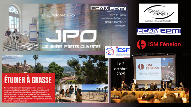Sous l’égide de Grasse Campus, IESF-CA était présent lors de la rentrée des formations d’enseignement supérieur de l’ISM Fénelon (Institut Supérieur de Management), le 2 octobre 2025 et lors des Journées Portes Ouvertes de l’ECAM (Ecole d’Ingénieurs en Génie énergétique), le 11 octobre 2025.